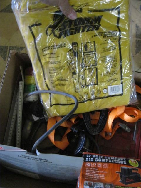 MISC. RAINGEAR, MEASURING STICKS, FISHING REEL, ETC.