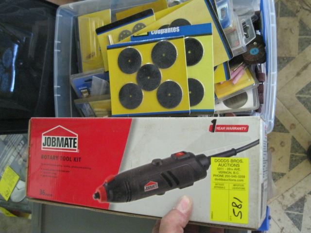 NEW JOBMATE ROTARY TOOL KIT & PLASTIC CONTAINER OF ASST. ROTARY BITS, SANDER PADS, ETC.