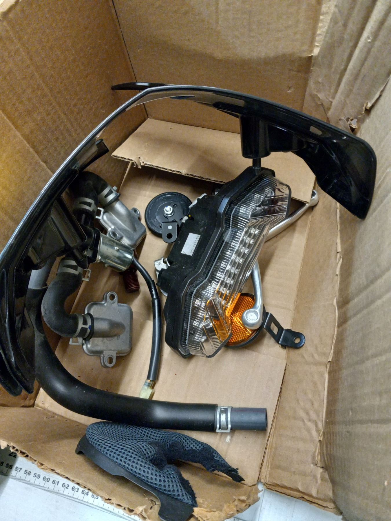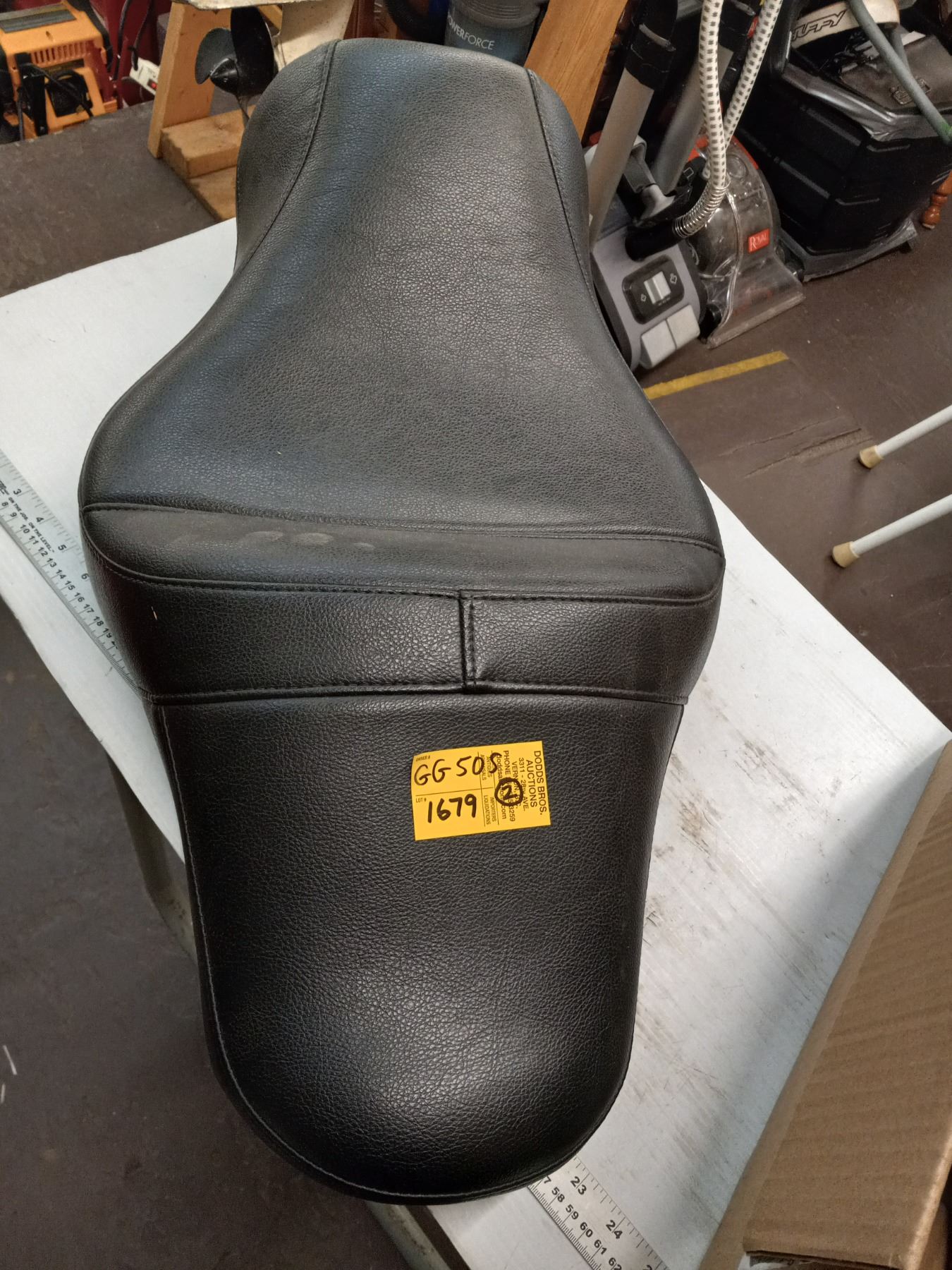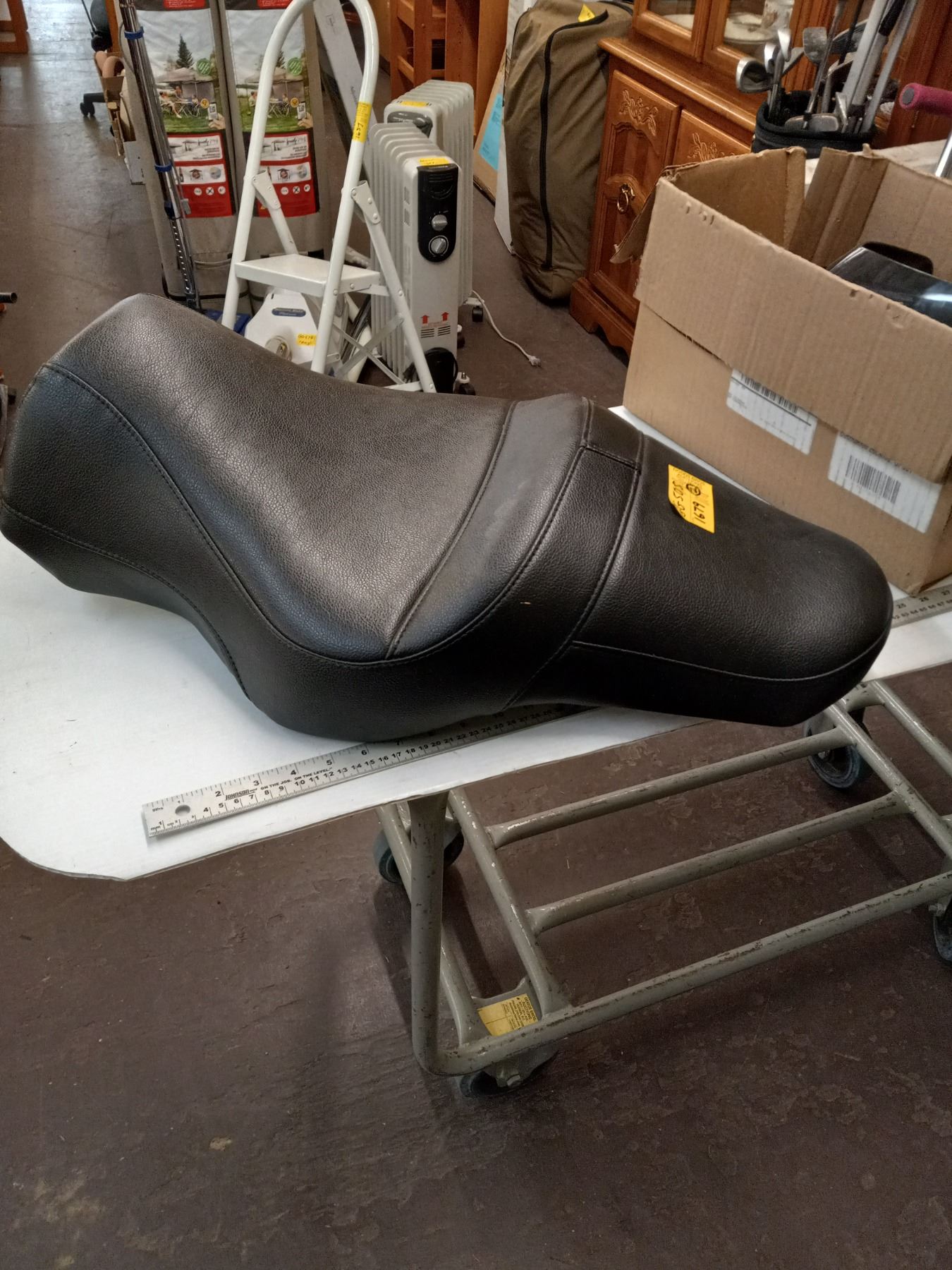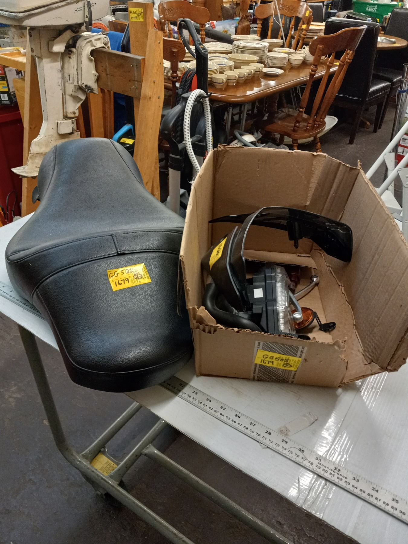 ONE MOTOR CYCLE SEAT AND BOX OF ASSORTED MOTOR CYCLE PARTS