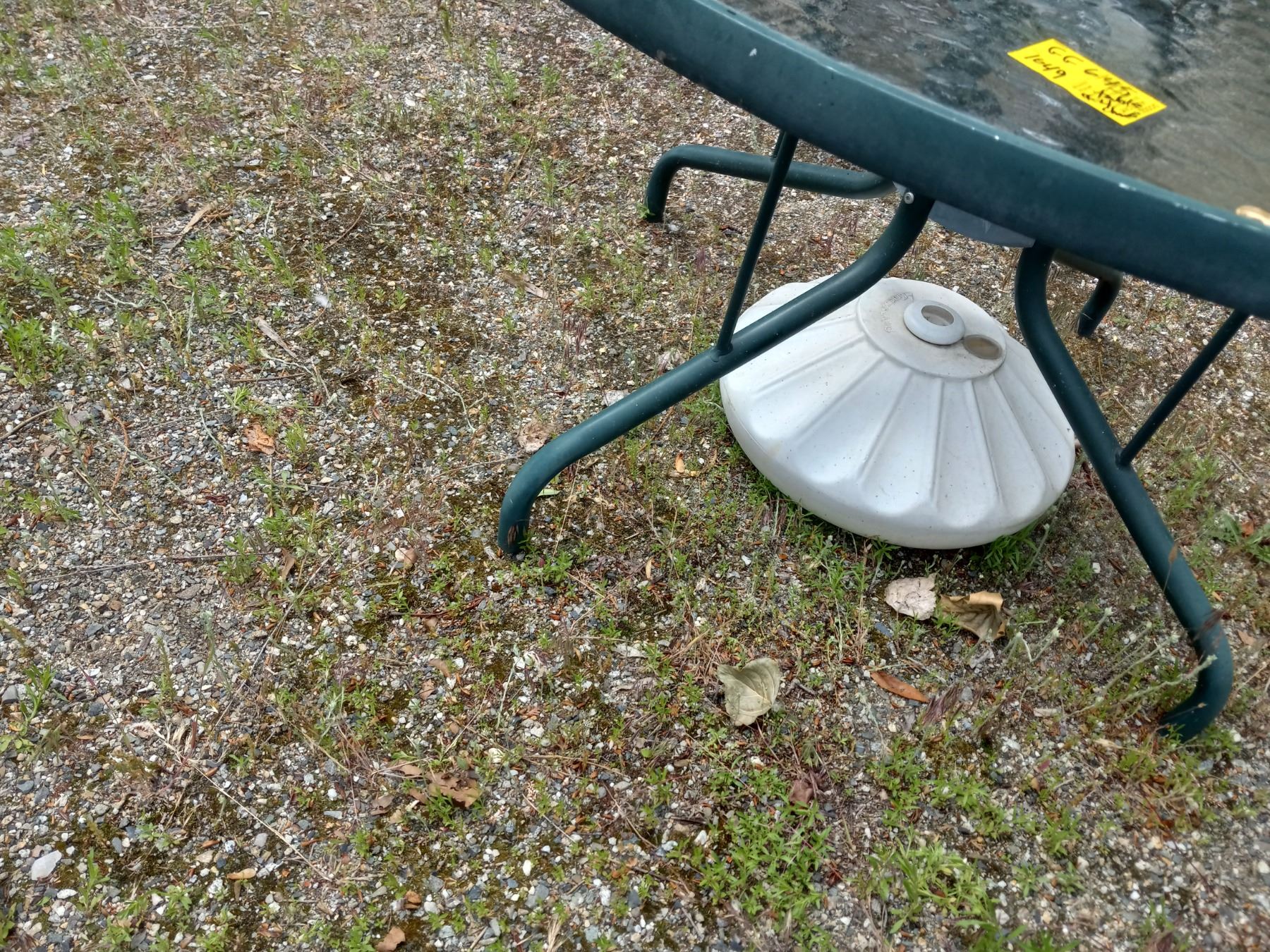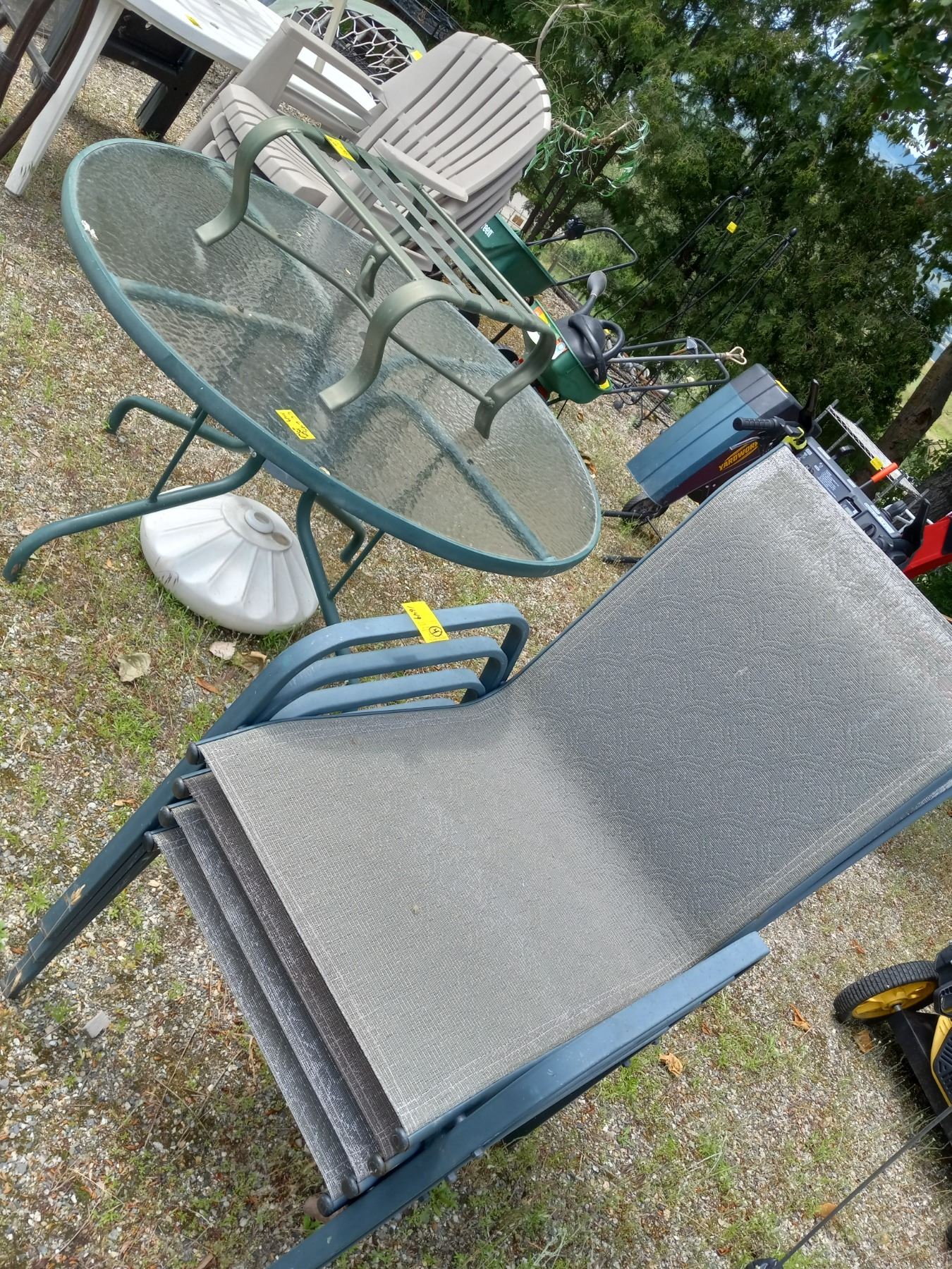 PATIO TABLE W/4 CHAIRS, UMBRELLA STAND, OTTOMAN & UMBRELLA
