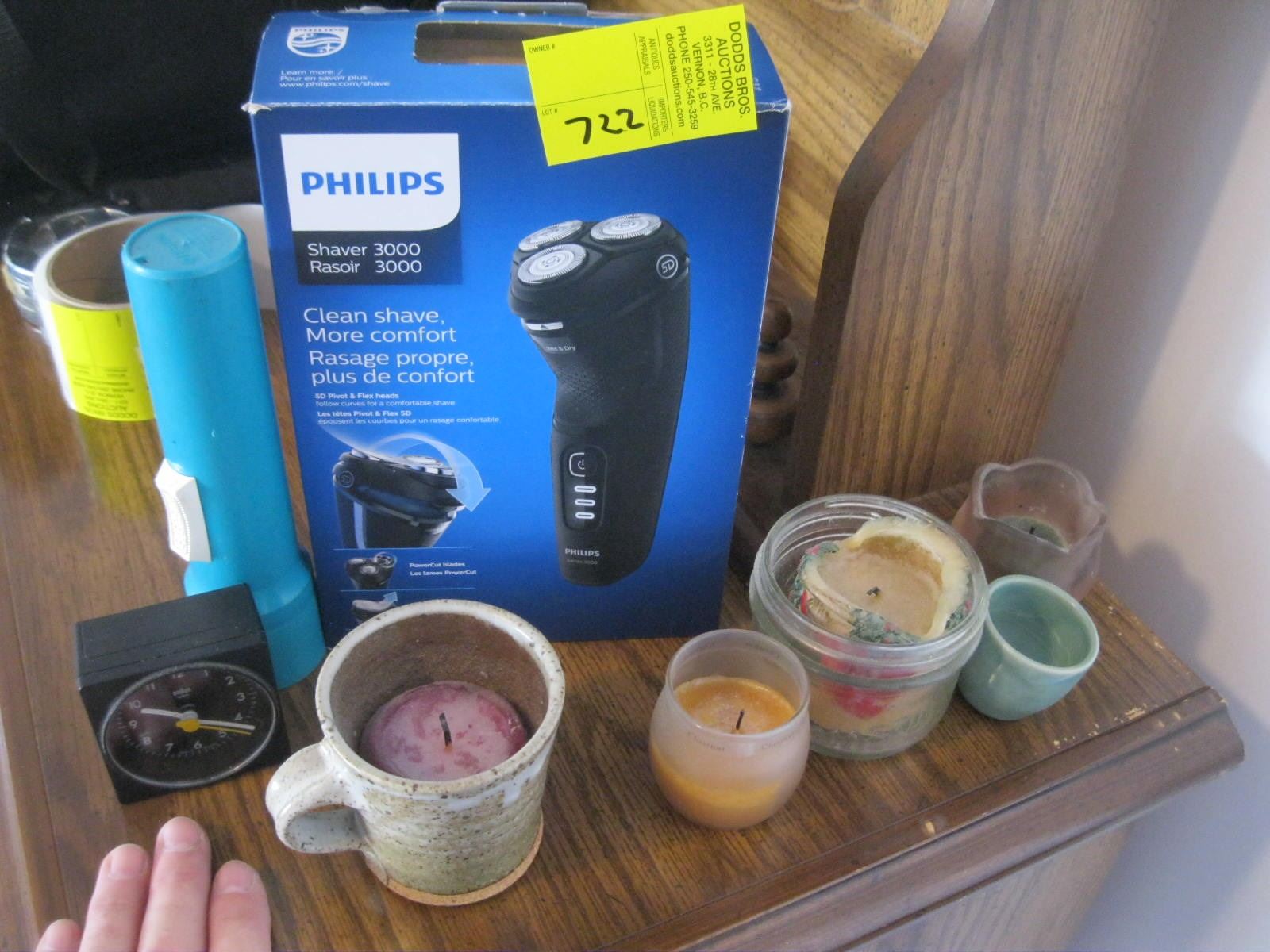 PHILLIPS PHILISAVE ELECTRIC RAZOR, CANDLES & SM. ALARM CLOCK