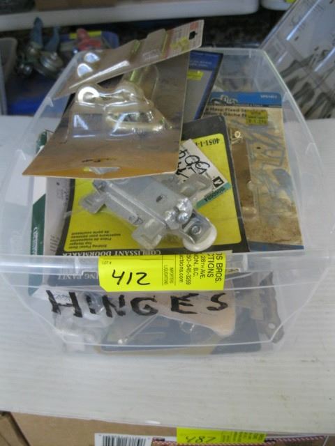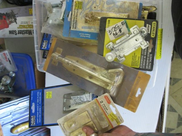 PLASTIC BIN OF ASSORTED HINGES, PAD BOLTS, ETC.