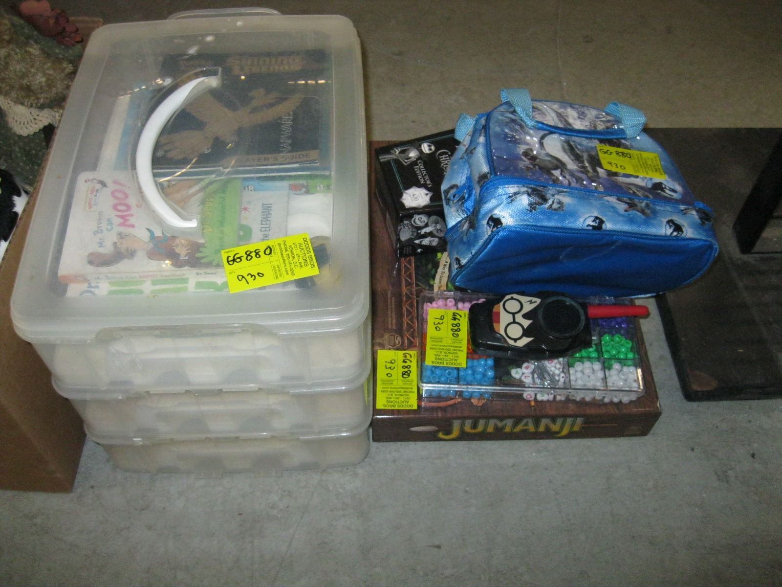 PLASTIC STORAGE CABINET W/BOOKS & A LOT OF MISC.