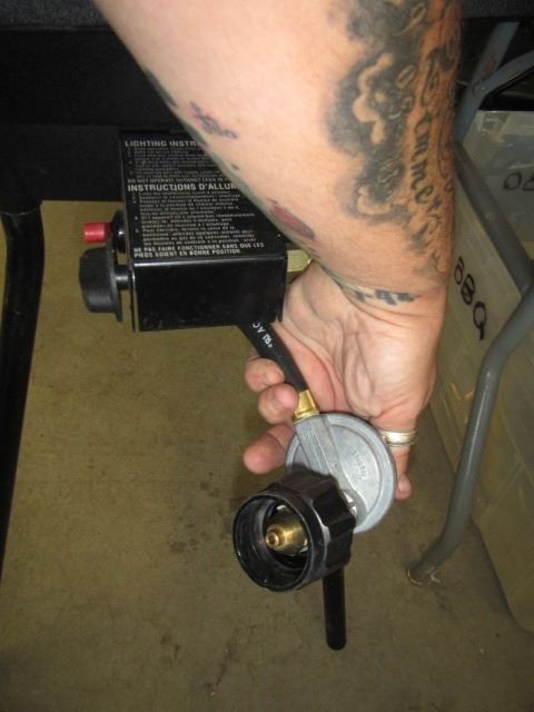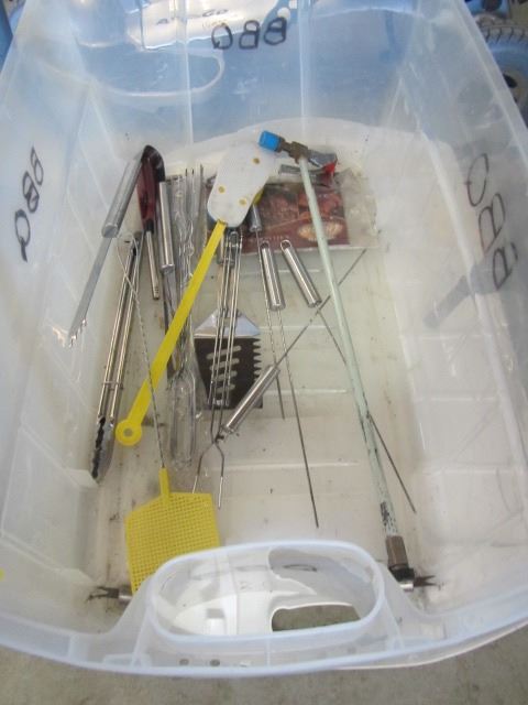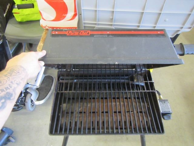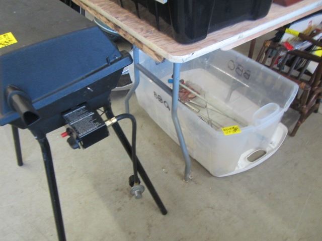 PORTA CHEF CAMPING BBQ WITH TOTE OF WIENER STICKS AND BBQ UTENSILS