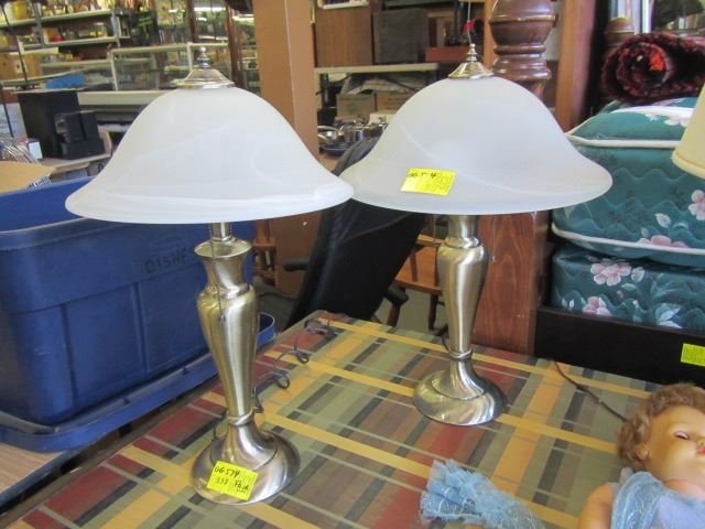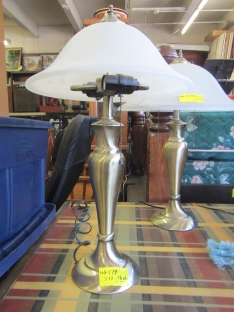 PR OF METAL BASE LAMPS WITH MILKY GLASS SHADES