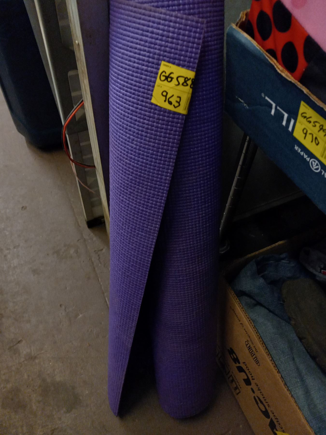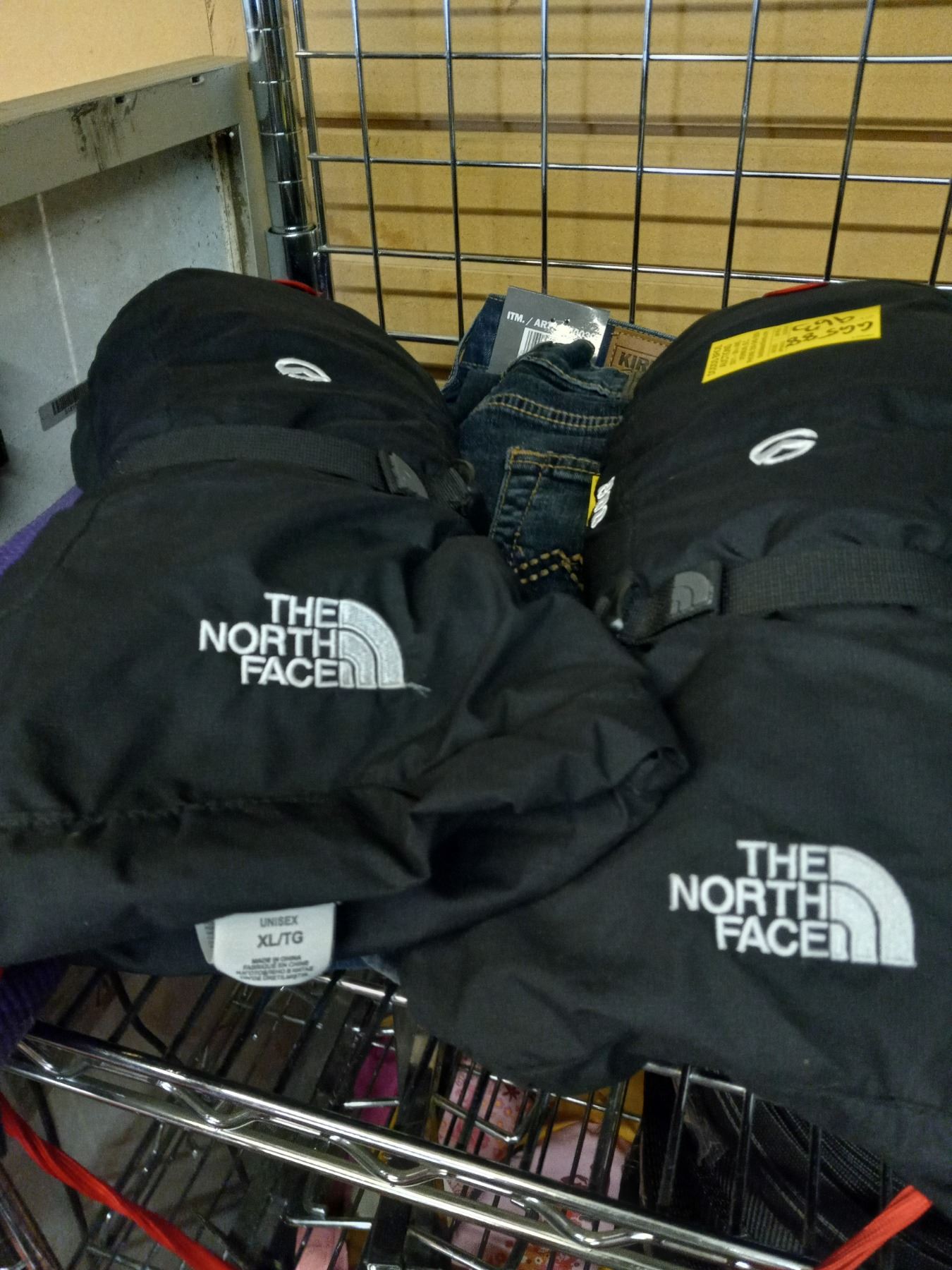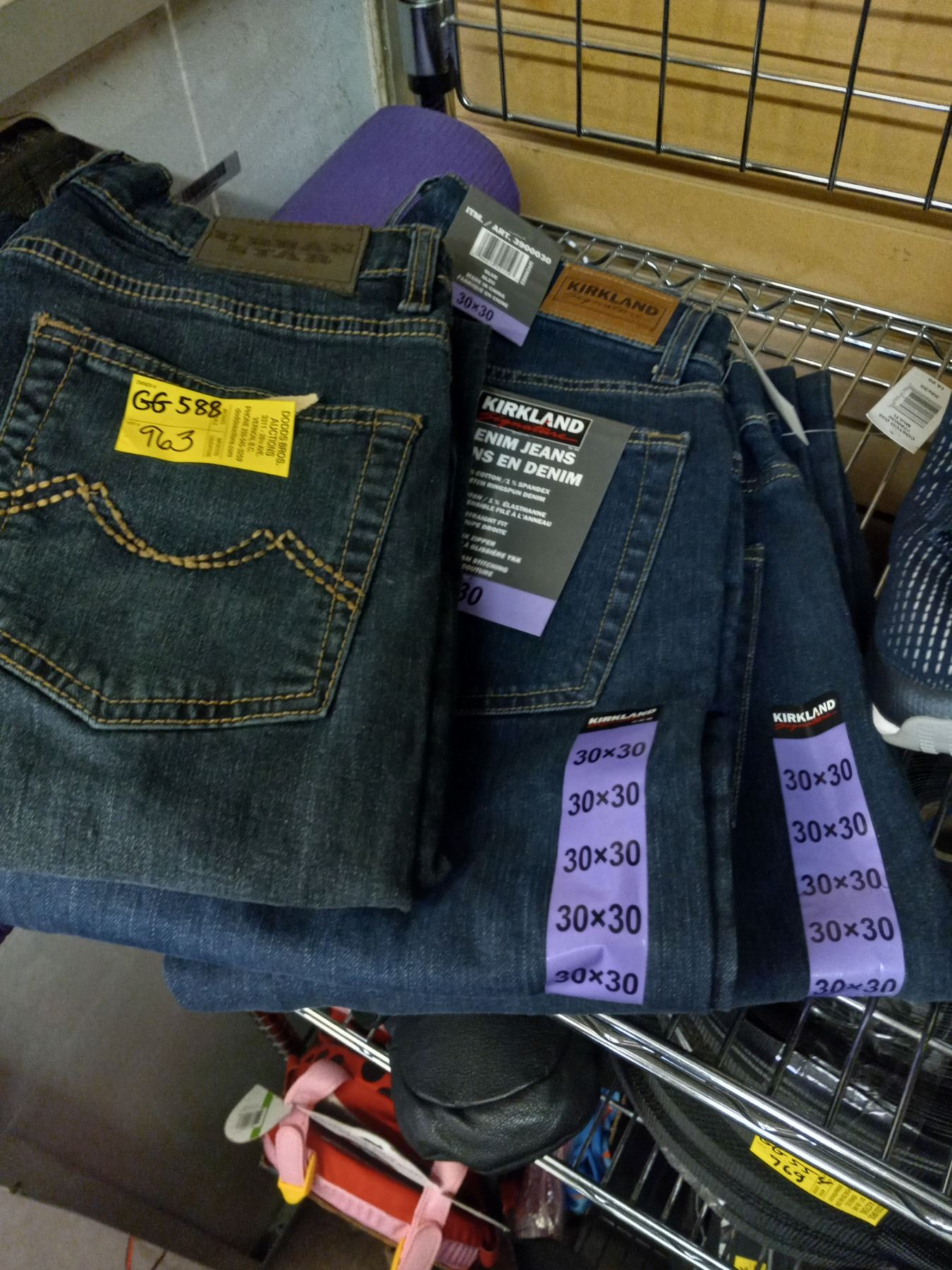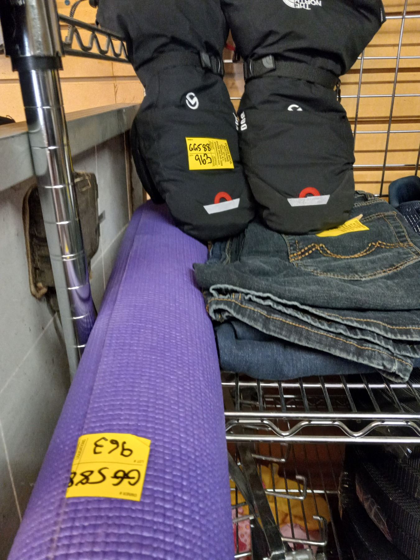 PURPLE YOGA MAT, PAIR OF NORTHERN FACE WINTER MITTS, AND 3 PAIRS OF NEW JEANS 30X30