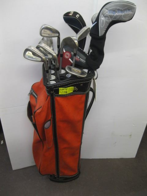 RED GOLF BAG WITH ASSORTED GOLDEN BEAR GOLF CLUBS, BIG BERTHA DRIVER ETC