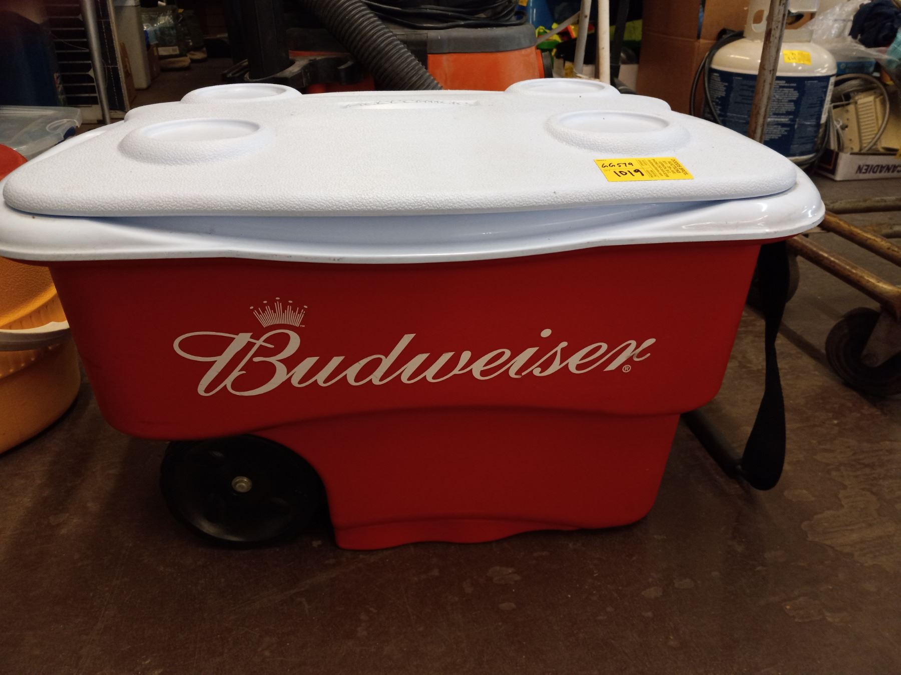 RED RUBBERMAID BUDWEISER COOLER WITH COOLER BAGS IN SIDE