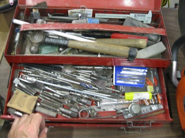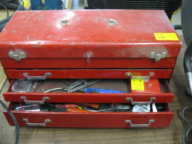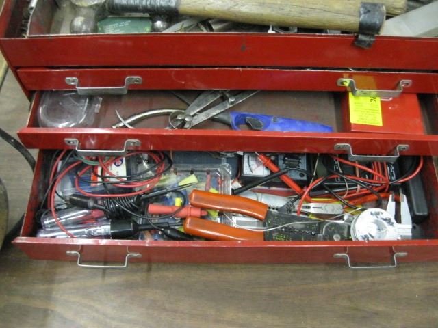 RED TOOL BOX WITH DRAWERS AND MISC TOOLS