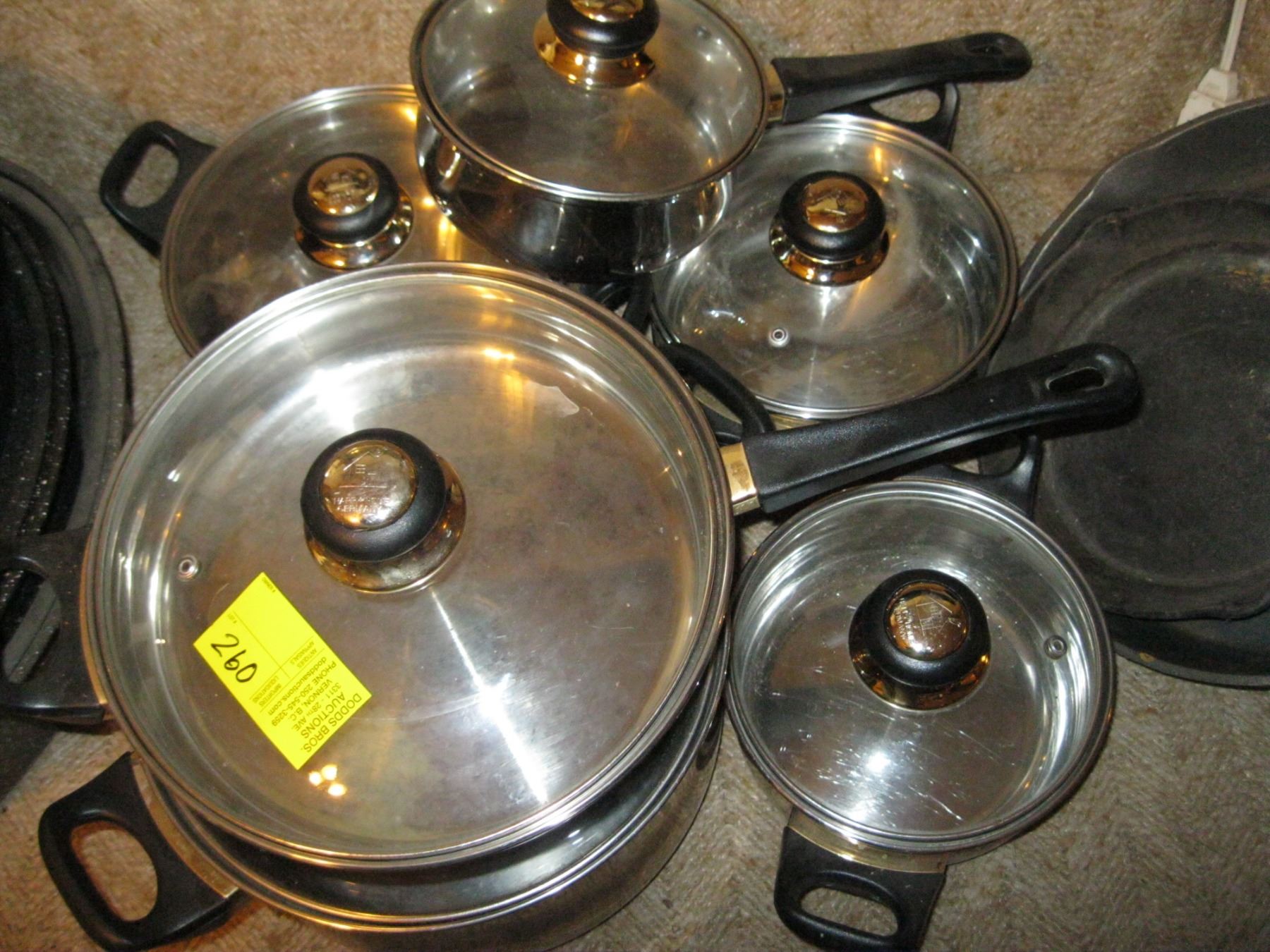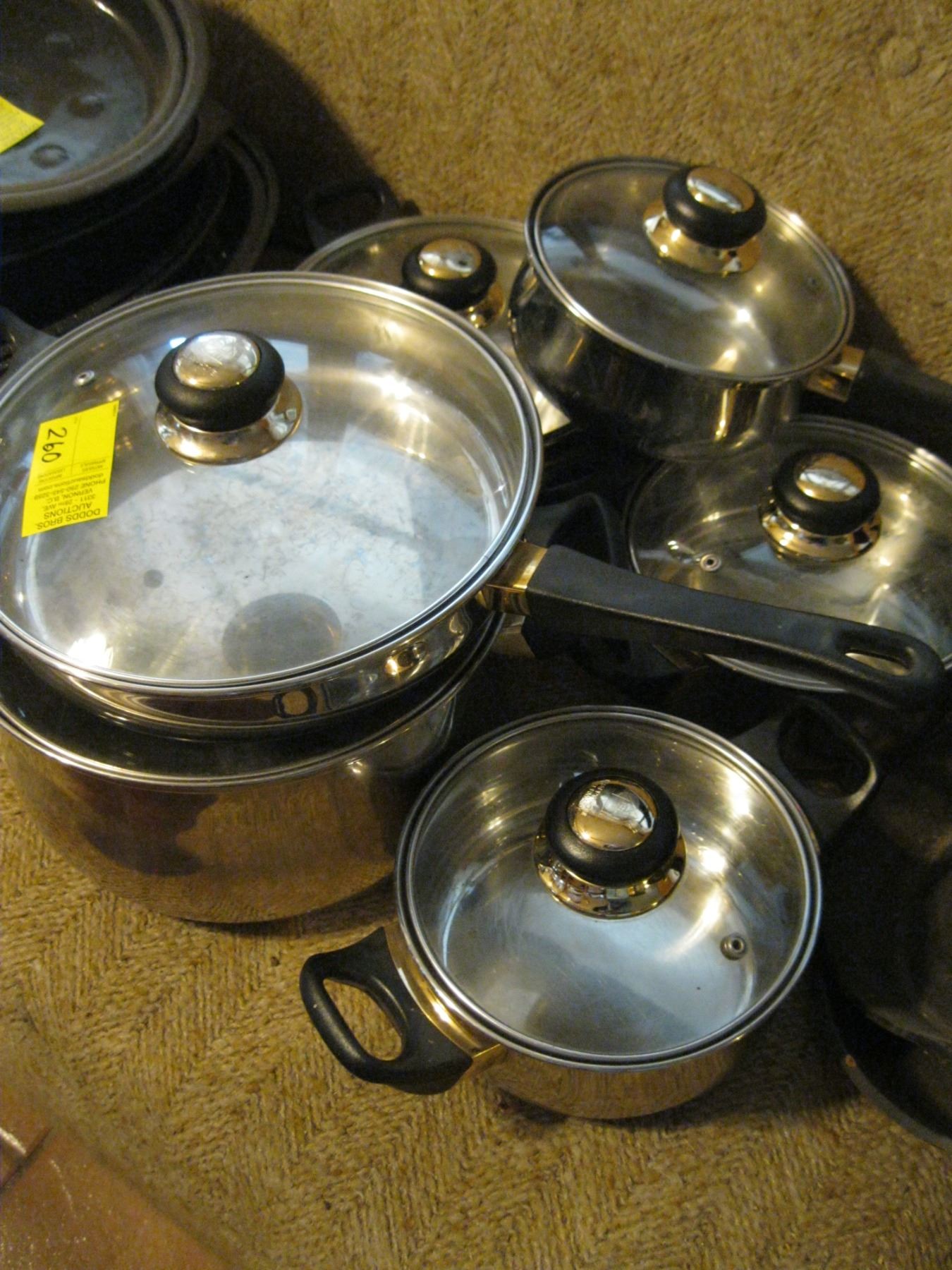 SET OF 6 'HAPPY HOME' STAINLESS W/GLASS TOP POTS & PANS