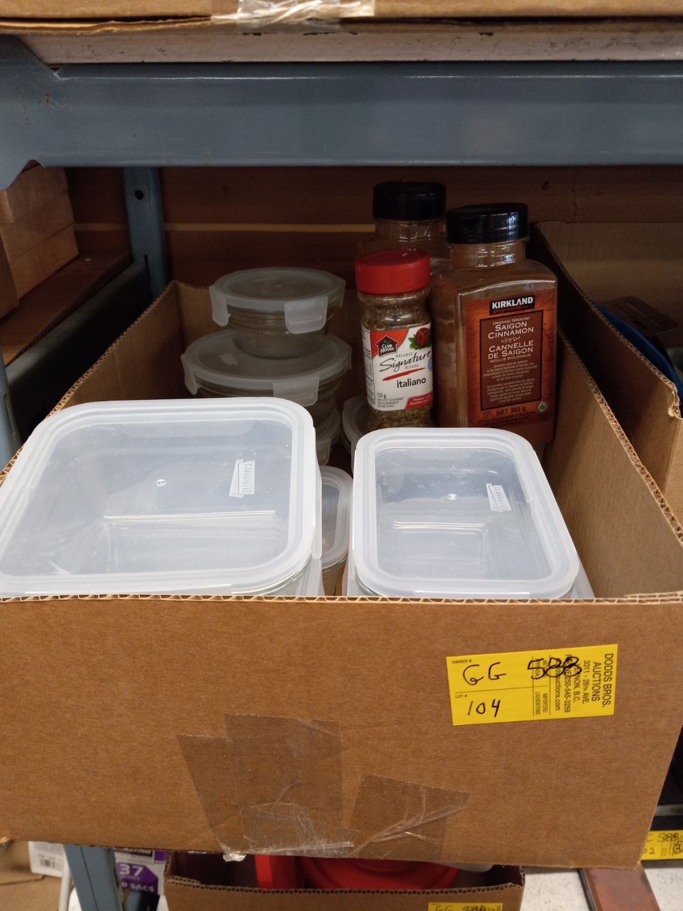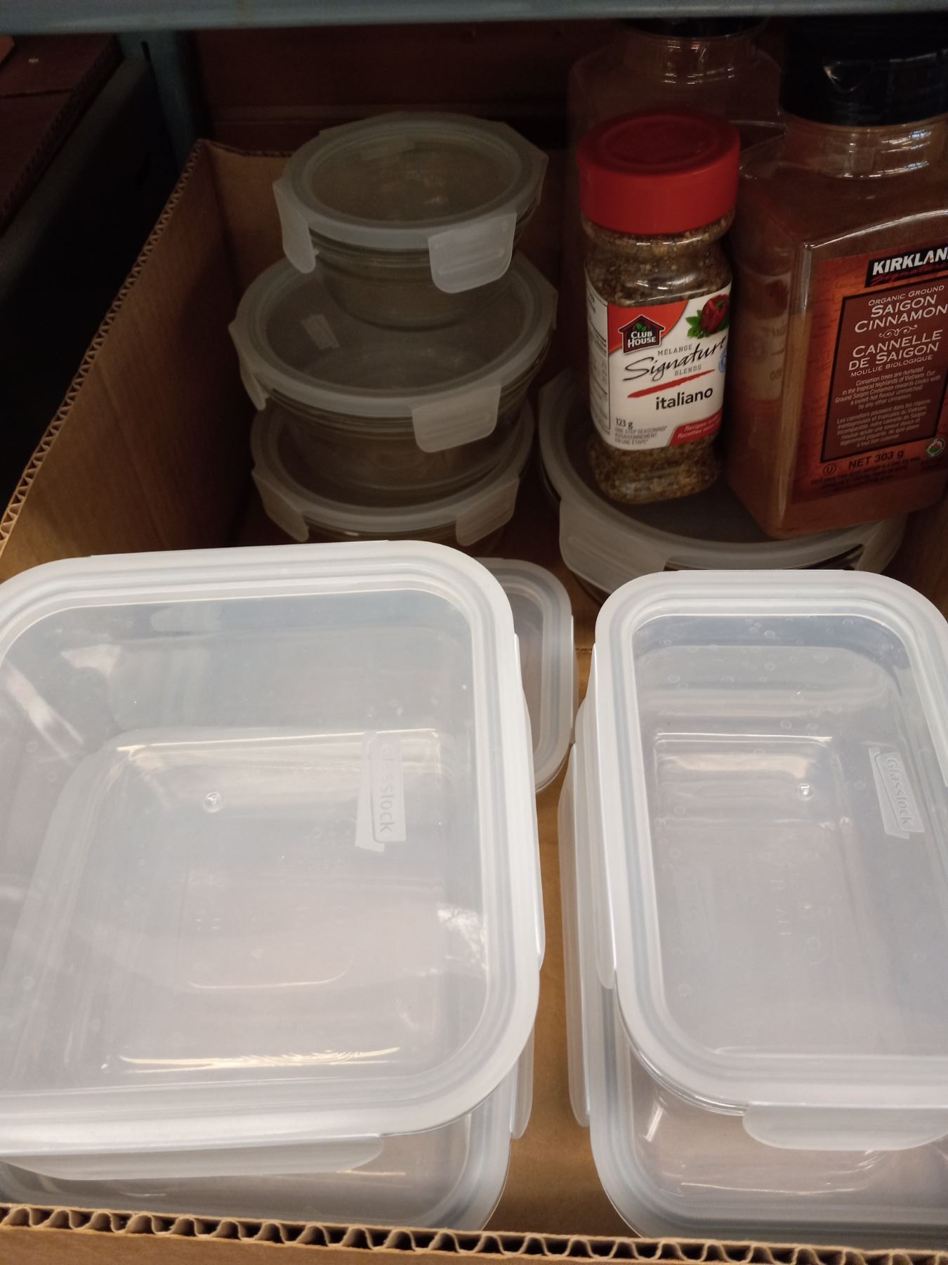 SET OF GLASS CONTAINERS W/LOCKING PLASTIC LIDS & SPICES
