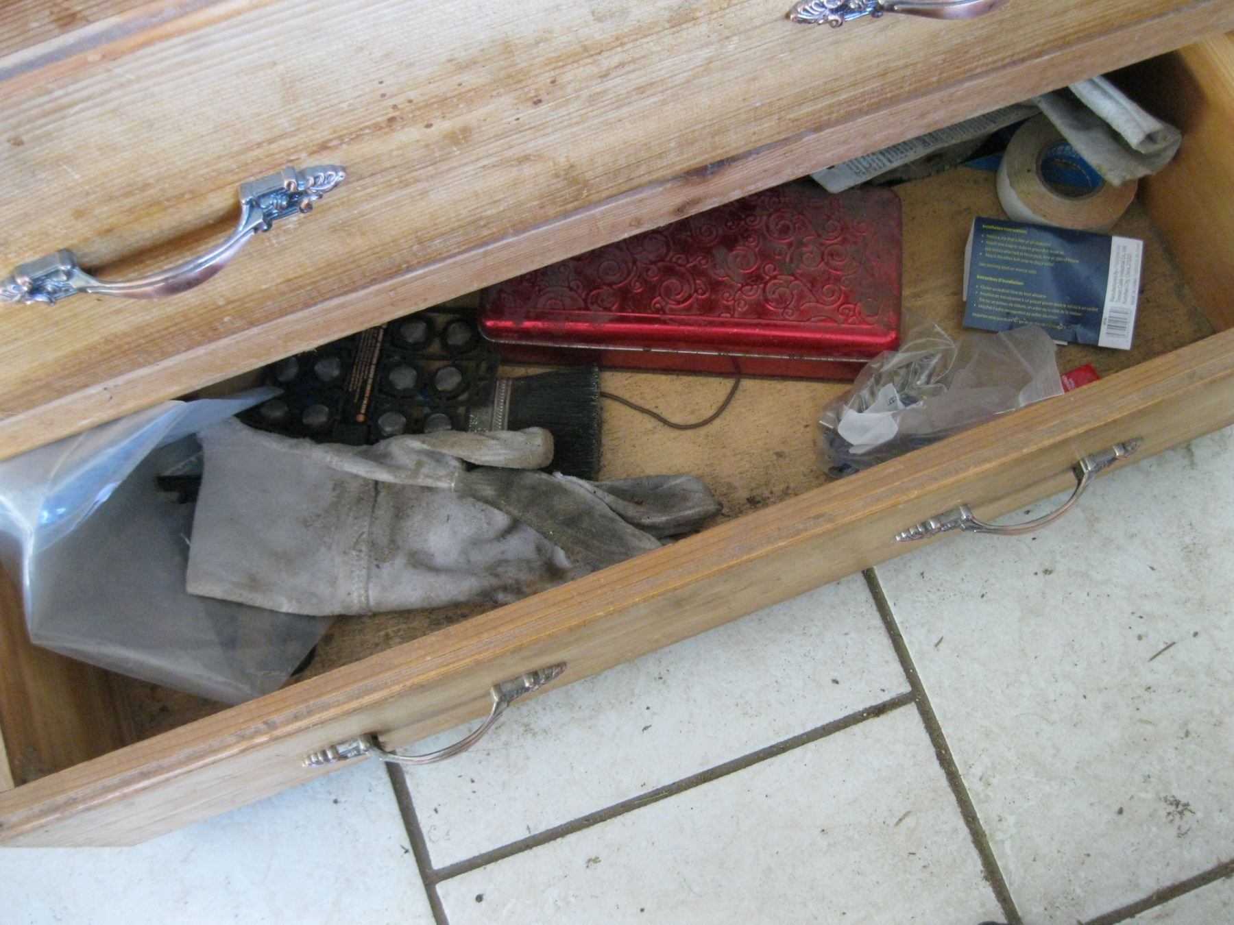 SMALL METALWORKER VARIABLE SPEED LATHE W/BOX OF ASSORTED TOOLING ON 3 DRAWER CHEST OF DRAWERS W/CONTENTS