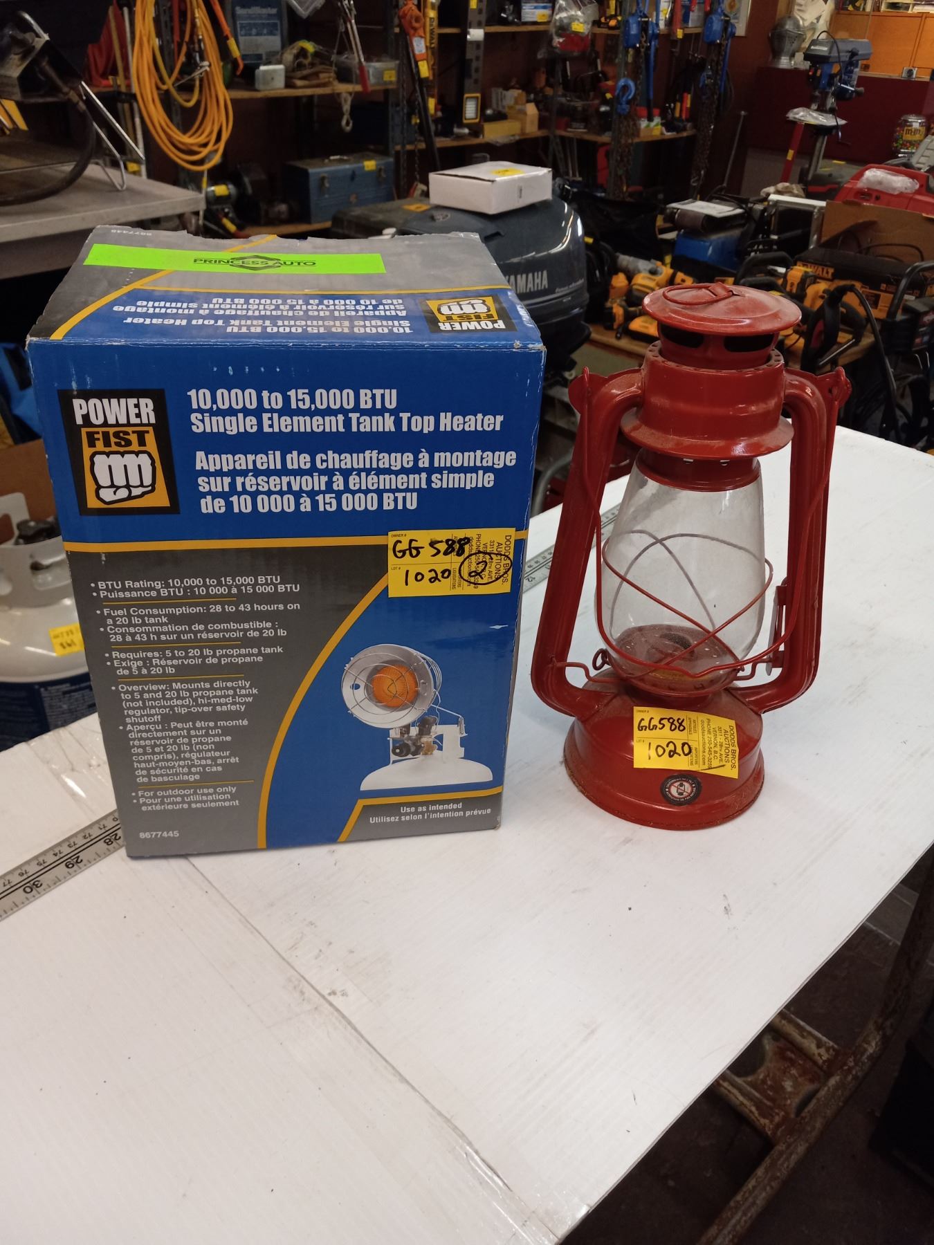 SMALL RED LANTERN AND A POWERFIST 10000-15000 BTU SINGLE ELEMENT TANK TOP HEATER