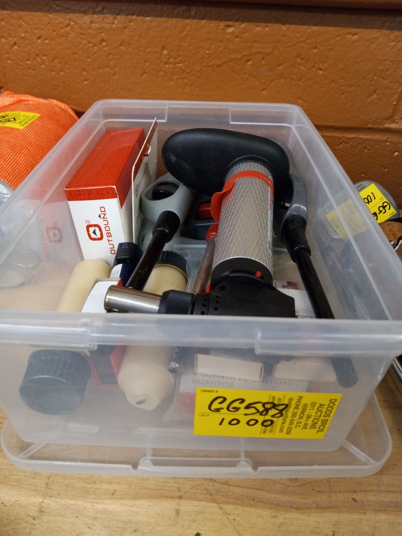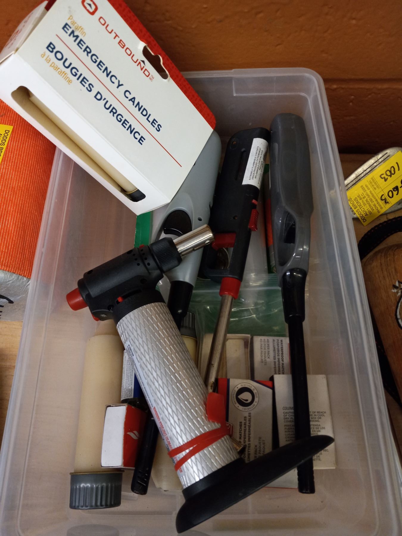 SMALL TOTE OF TORCH, LIGHTERS ETC