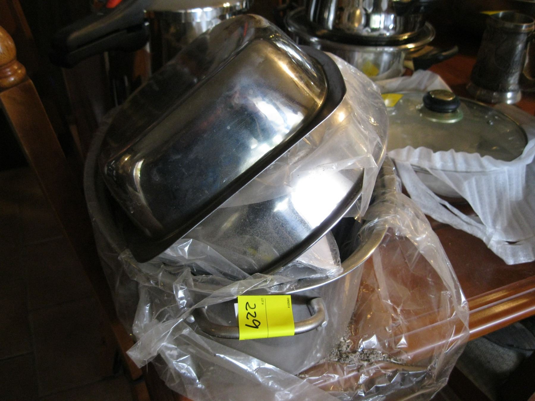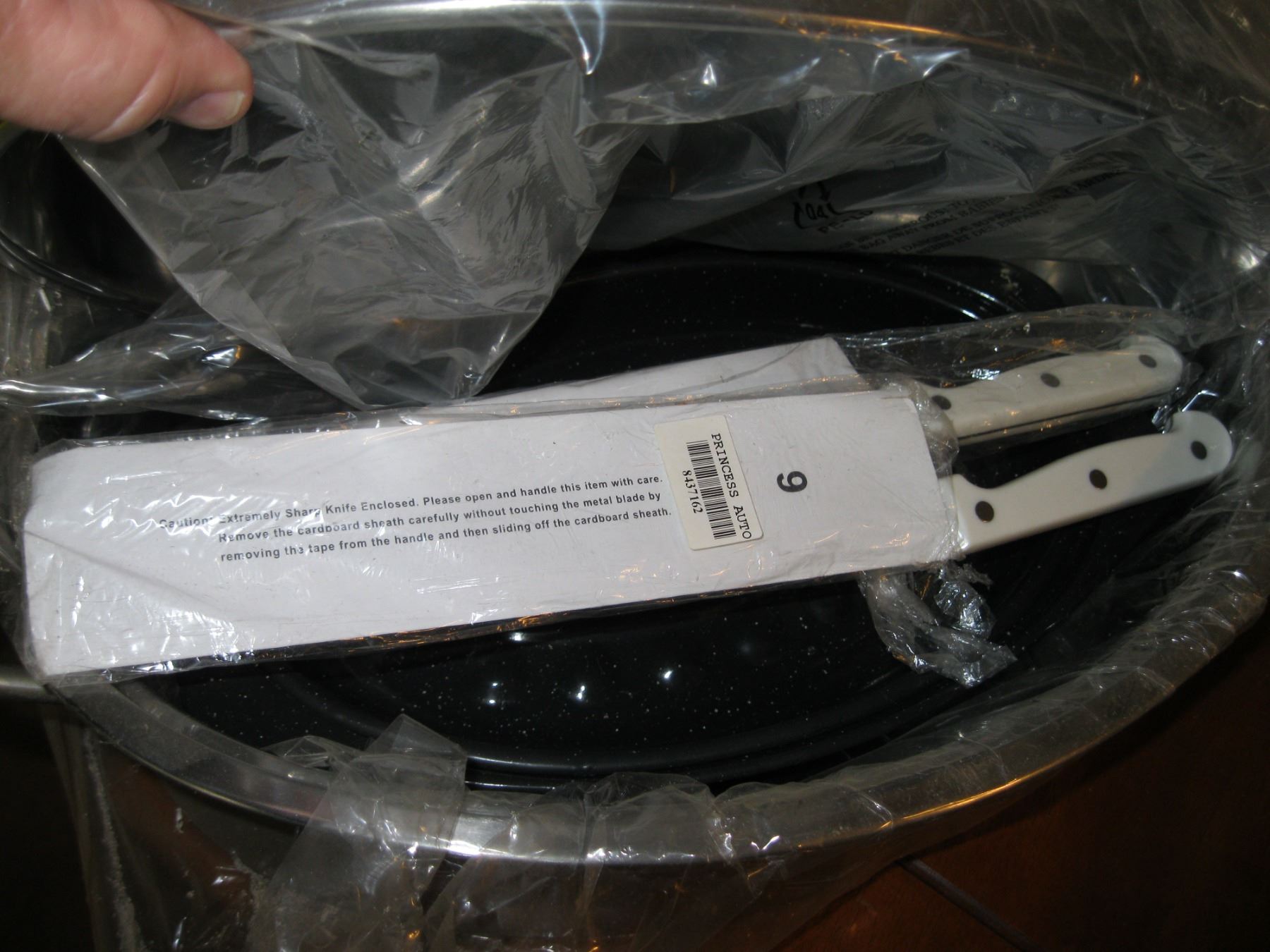 SS ROASTING PAN, NEW KNIVES, ENAMEL ROASTER, ETC.