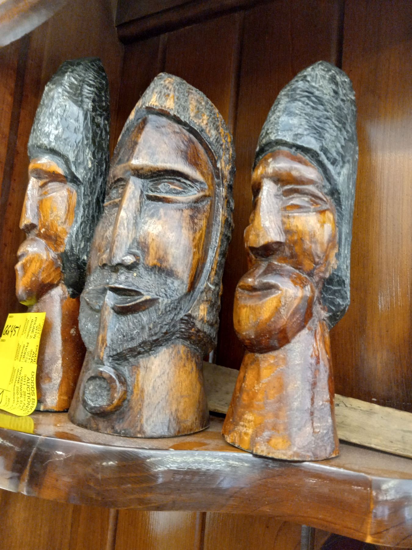 THREE CARVED WOODEN HEADS AND SPOON