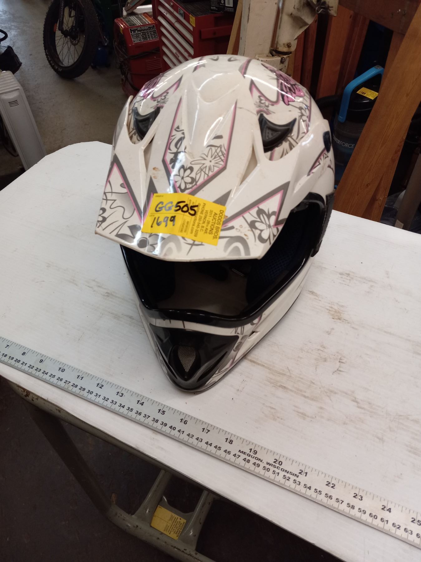 WHITE PINK AND GREY MOTORCYCLE HELMET, MISSING BLACK SCREW ON CAP ON 1 SIDE OF VISOR