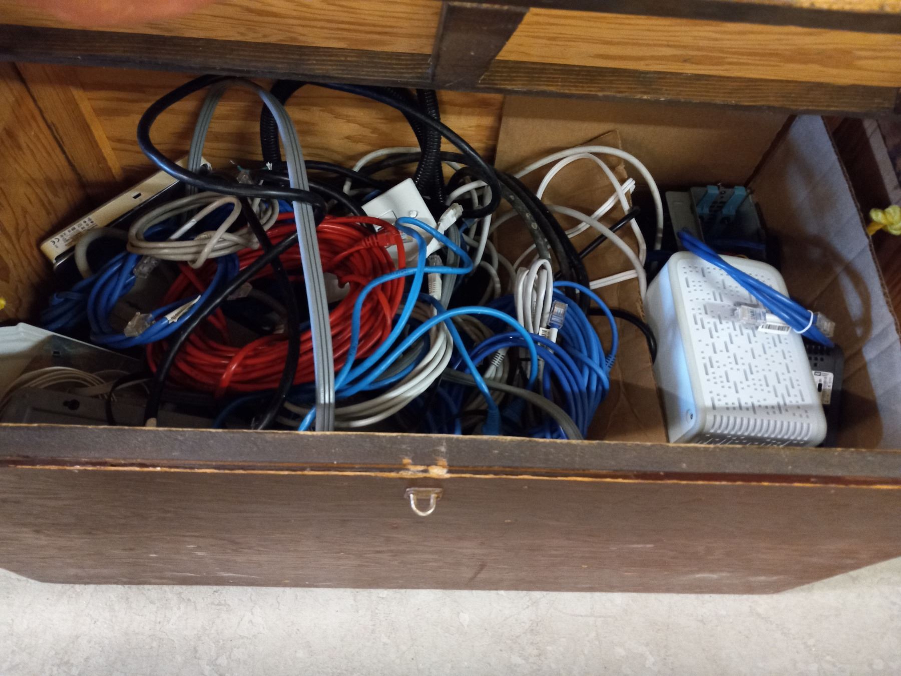 WOOD BIN OF MISC. COMPUTER WIRE & HARDDRIVE COVERS