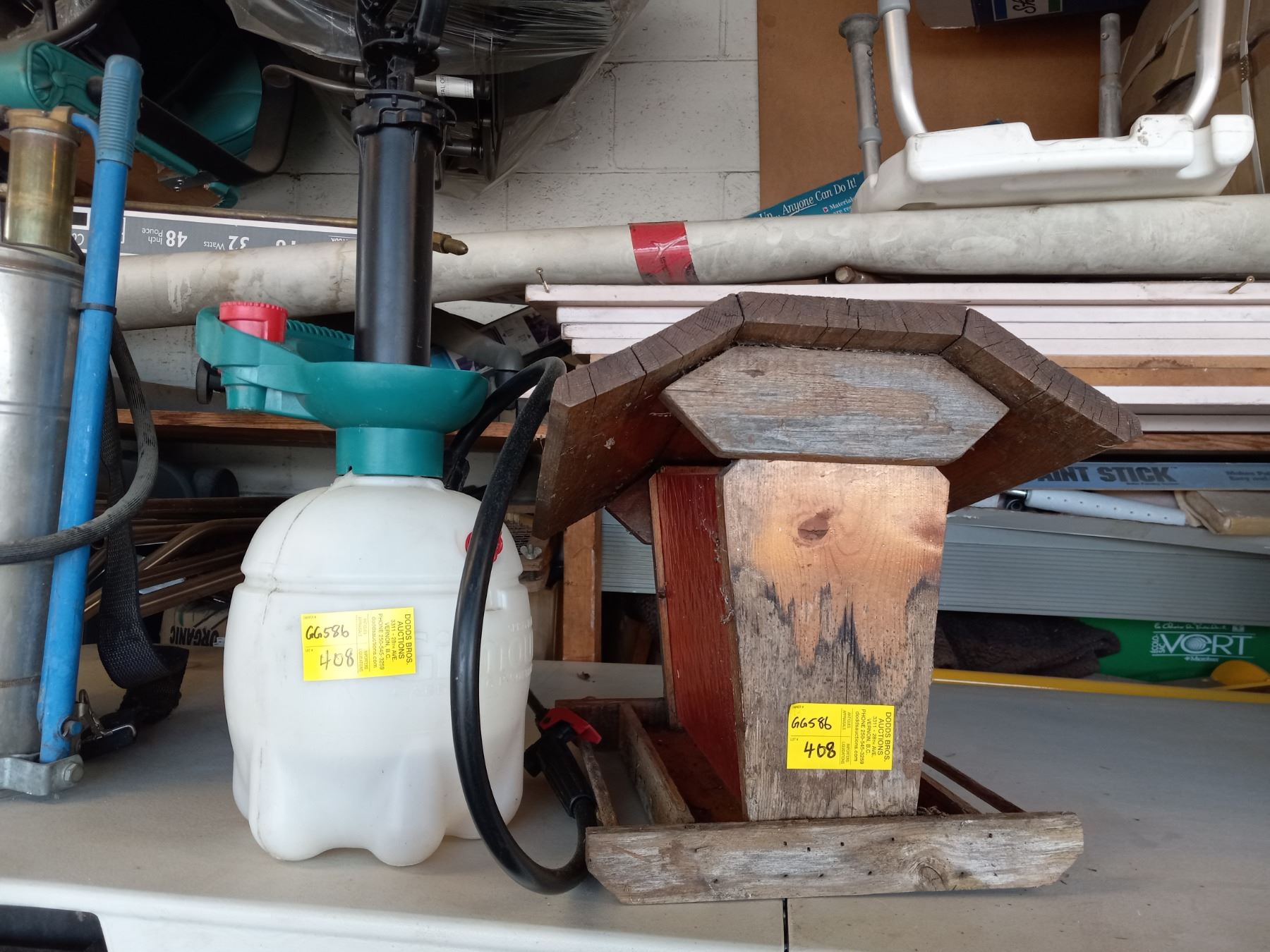 WOODEN BIRD FEEDER WITH PLEXI GLASS AND GILMORE GARDEN SPRAYER